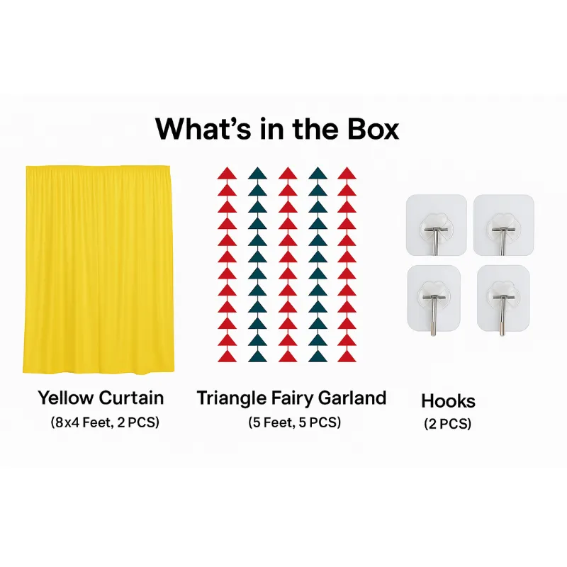 Ramgarhia’s Pooja & Festival Decoration Backdrop Cloth with Tringle Garlands | Ideal for Navratri, Diwali, Varalakshmi Vratham & Home Mandir Create a divine and festive ambiance at your home with this beautiful Pooja & Festival Decoration Backdrop Cloth. Made with premium-quality fabric in bright yellow, this backdrop comes with Triangle fairy garland and Multi colour triangle fairy garlands, giving your pooja corner a traditional yet vibrant look. Perfect for Navratri, Diwali, Varalakshmi Vratham, Ganesh Chaturthi, and daily temple setup, this backdrop instantly enhances the spiritual environment of your home or office (9 Pc) (Net)