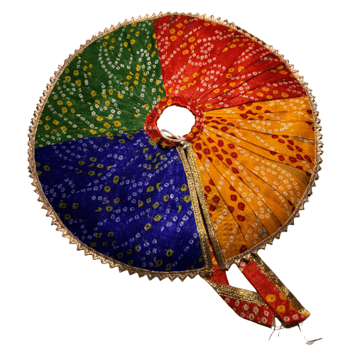 Bring the charm of Rajasthan to your Thakur Ji’s shringar with our Rajasthani Bandhani Multicolor Laddu Gopal Poshak. This handcrafted dress is made using premium Bandhani-printed fabric, symbolizing joy and devotion. The poshak features four vibrant color panels – red, green, yellow, and blue – each adorned with delicate white patterns, and is finished with a shimmering golden lace border for a festive look.