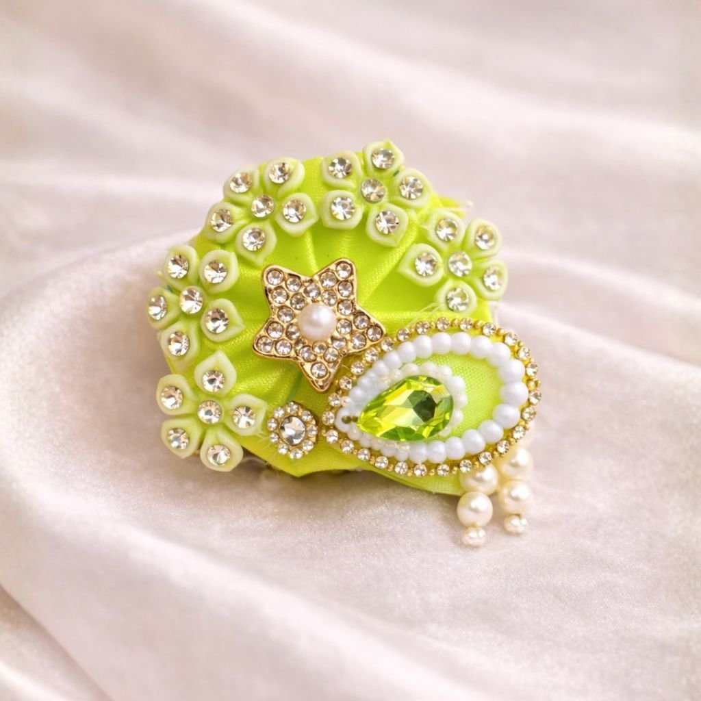 The Laddu Gopal Ji Pagdi features a stunning handcrafted design adorned with sparkling stones, pearls, and decorative elements that reflect traditional Indian artistry. Carefully arranged embellishments give this pagdi a royal and graceful appearance, perfectly complementing the divine personality of Bal Gopal. The vibrant colors and premium finishing make it an ideal choice for devotees who love to dress Laddu Gopal Ji with devotion and care.